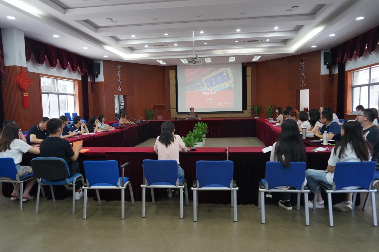 7月30日上午,上海交通大學(xué)出版社新員工培訓(xùn)第三講在張?jiān)獫?jì)講堂舉行。本次活動(dòng)由張文靜主持,編委會(huì)主任張?zhí)煳党鱿⒆髁恕冻霭嫔鐟浲分黝}報(bào)告。全體新員工共計(jì)30余人參加了本次培訓(xùn)。