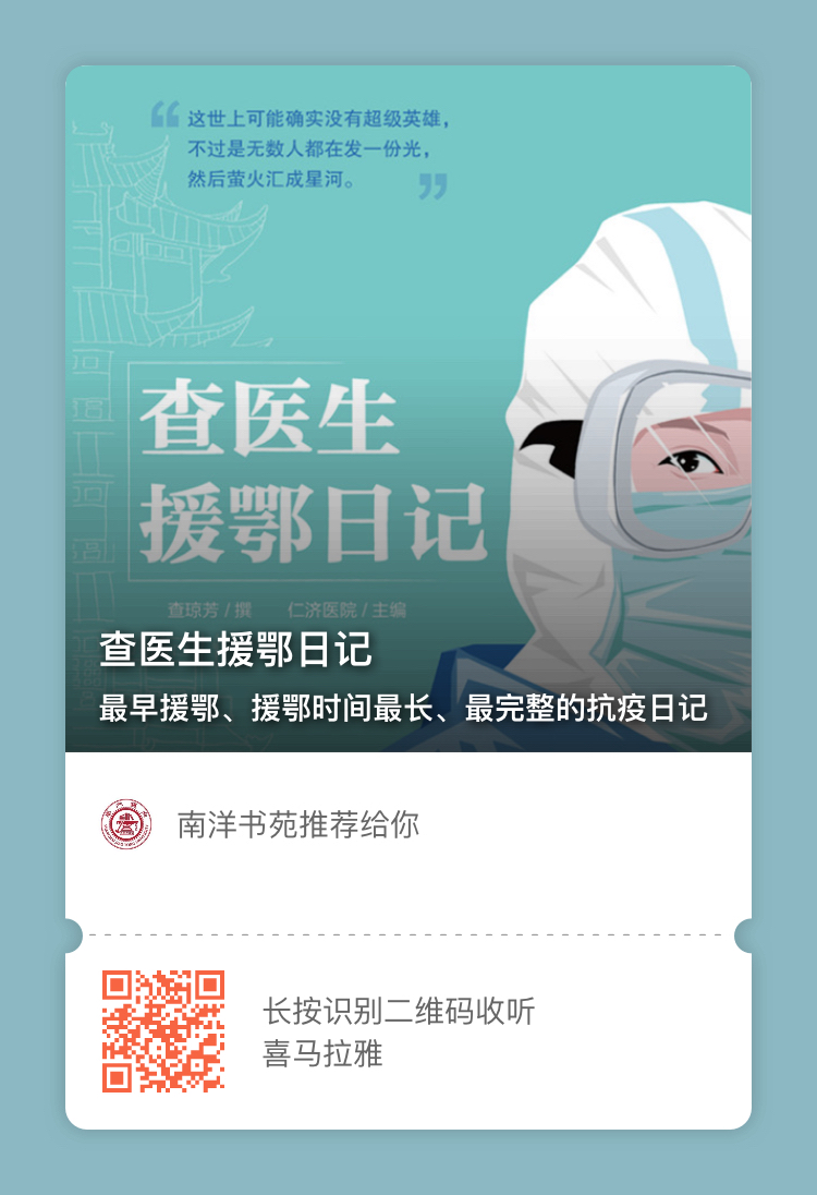 查醫(yī)生來了!由上海交通大學(xué)出版社出版的國(guó)內(nèi)首部醫(yī)生抗疫日記《查醫(yī)生援鄂日記》自4月26日紙質(zhì)書問世以來,榮登“光明書榜”、“上海市民修身書單”等,受到國(guó)內(nèi)外數(shù)十家媒體廣泛關(guān)注,實(shí)體書店、網(wǎng)絡(luò)書店頻頻追加訂單,僅一個(gè)月就印刷4次,引發(fā)社會(huì)各界強(qiáng)烈反響,成為“現(xiàn)象級(jí)戰(zhàn)疫好書”。如今,它再出新動(dòng)作——即日起,上海交通大學(xué)出版社隆重推出《查醫(yī)生援鄂日記》有聲書,在喜馬拉雅、愛奇藝、學(xué)習(xí)強(qiáng)國(guó)、慕知悅讀等平臺(tái)陸續(xù)上線,免費(fèi)向用戶開放,用戶可通過掃碼免費(fèi)收聽。