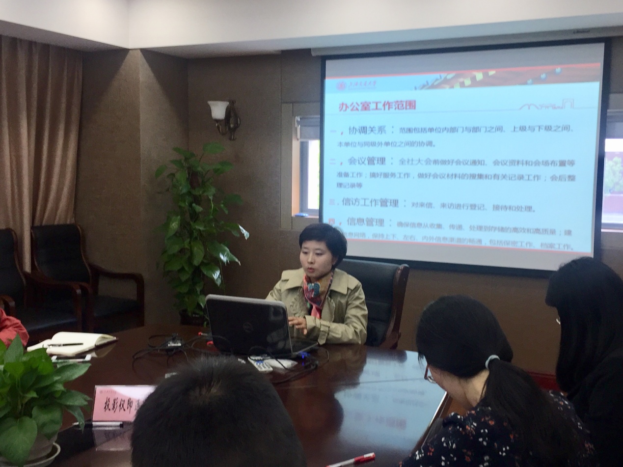 培訓(xùn)第二講由行政辦趙利潤老師進行講解。趙老師首先介紹了行政辦崗位職責(zé)和分工。之后分別從辦公用品領(lǐng)用、會議室申請、用車流程、用印流程等方面一一作了詳細介紹。趙老師以會議室申請為例指出,會議室申請這一環(huán)節(jié)雖然看似很小,但是關(guān)鍵時刻卻會影響整件事情的進度,希望大家務(wù)必做到事先申請,以便行政辦提前做好安排。