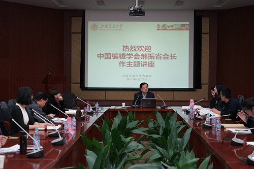 4月27日下午,中國編輯學(xué)會會長、上海交通大學(xué)出版?zhèn)髅窖芯吭涸洪L郝振省在上海交通大學(xué)出版社張?jiān)獫?jì)講堂,給出版社的編輯以及媒體與設(shè)計(jì)學(xué)院的學(xué)生上了一堂高屋建瓴而又具體可行的主題出版課。