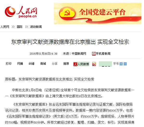 中央電視臺(tái)、新華社、人民網(wǎng)對(duì)“東京審判立體化出版工程”分別作了多次報(bào)道。