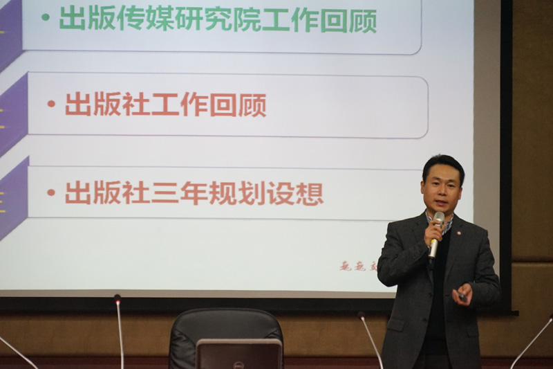 會(huì)上,鄭益慧作了題為“院社合力、引領(lǐng)發(fā)展”的研究院與出版社工作報(bào)告。他指出,出版?zhèn)髅窖芯吭簭?015年6月成立伊始,就得到了上海市和學(xué)校的大力支持,其輝煌的起點(diǎn)值得銘記。結(jié)合研究院運(yùn)行一年來(lái)遇到的實(shí)際問(wèn)題,鄭益慧提出要認(rèn)真貫徹研究院章程,實(shí)現(xiàn)人才立項(xiàng)、項(xiàng)目立院、品牌立庫(kù),建立機(jī)制和人員保障,確保工作執(zhí)行、推進(jìn)和落實(shí)。最后,鄭益慧向與會(huì)特聘研究員介紹了出版社2016年度精品圖書(shū)出版成果以及三年規(guī)劃設(shè)想。