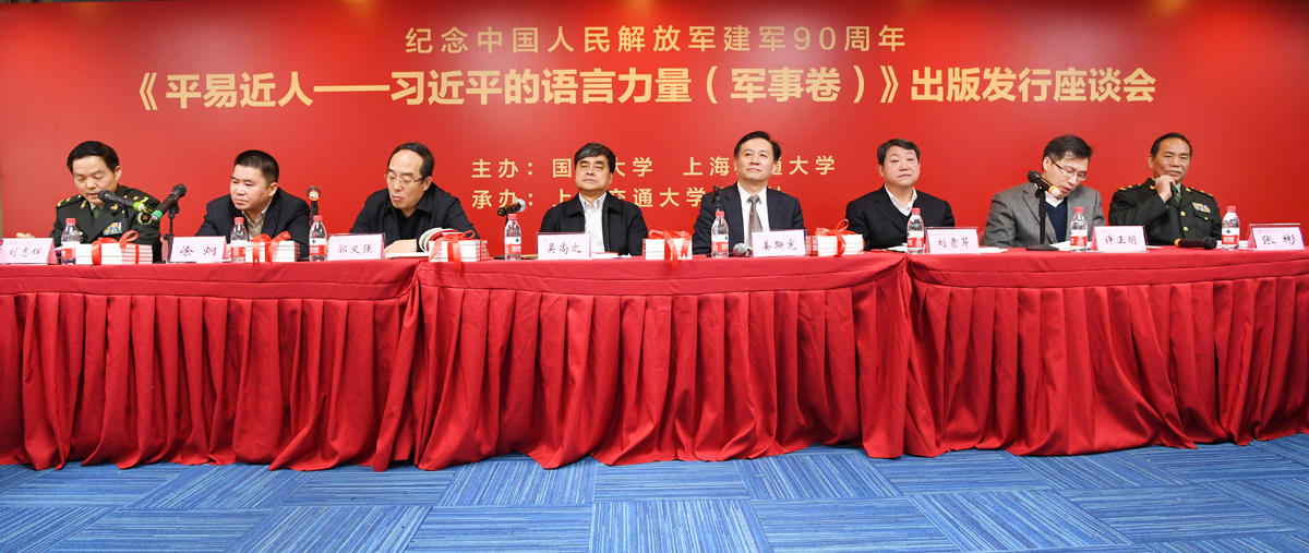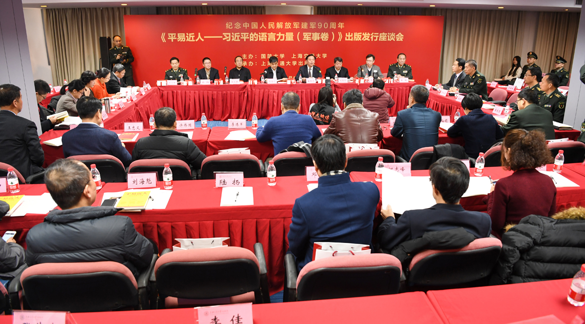 1月12日,由國防大學(xué)、上海交通大學(xué)主辦的《平易近人——習(xí)近平的語言力量(軍事卷)》出版發(fā)行座談會(huì)在北京舉行。國家新聞出版廣電總局副局長吳尚之,上海市人大常委會(huì)副主任、上海交通大學(xué)黨委書記姜斯憲,中宣部出版局局長郭義強(qiáng),教育部社會(huì)科學(xué)司司長劉貴芹,上海市新聞出版局局長徐炯,國家新聞出版廣電總局出版管理司副司長許正明,上海市新聞出版局副局長彭衛(wèi)國出席會(huì)議。本書主編、國防大學(xué)軍隊(duì)建設(shè)與軍隊(duì)政治工作教研部副主任劉志輝少將介紹圖書編撰特點(diǎn)。國防大學(xué)馬克思主義教研部原副主任張彬少將進(jìn)行專家點(diǎn)評(píng)。平易近人——習(xí)近平的語言力量(軍事卷)》由上海交通大學(xué)出版社出版發(fā)行,出版社社長鄭益慧主持座談會(huì)。