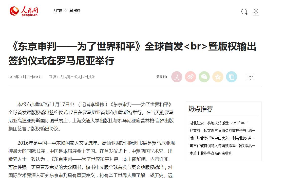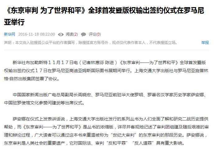 11月17日,上海交通大學出版社聯(lián)合施普林格·自然出版集團主辦的《東京審判——為了世界和平》一書中文版新書發(fā)布暨英文版權輸出儀式在羅馬尼亞高迪亞姆斯國際圖書與教育展上成功舉辦,本次活動被列為書展中國主賓國重點活動之一。