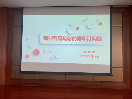 首先由出版部陳彬做題為“那些想不到的排印訂錯誤”的交流發(fā)言,主要從正文印裝、封面、正文版式設(shè)計及排版問題等三個方面進行介紹。通過各種案例分析,直觀地讓編輯了解在下印正文稿件前需注意的地方。比如,封面和版權(quán)頁相關(guān)信息一致性問題,正文版式設(shè)計出血和成書效果問題,通過調(diào)整部分頁面的排版節(jié)約印張問題,排版稿、回稿修改易出版差錯的問題,等等。