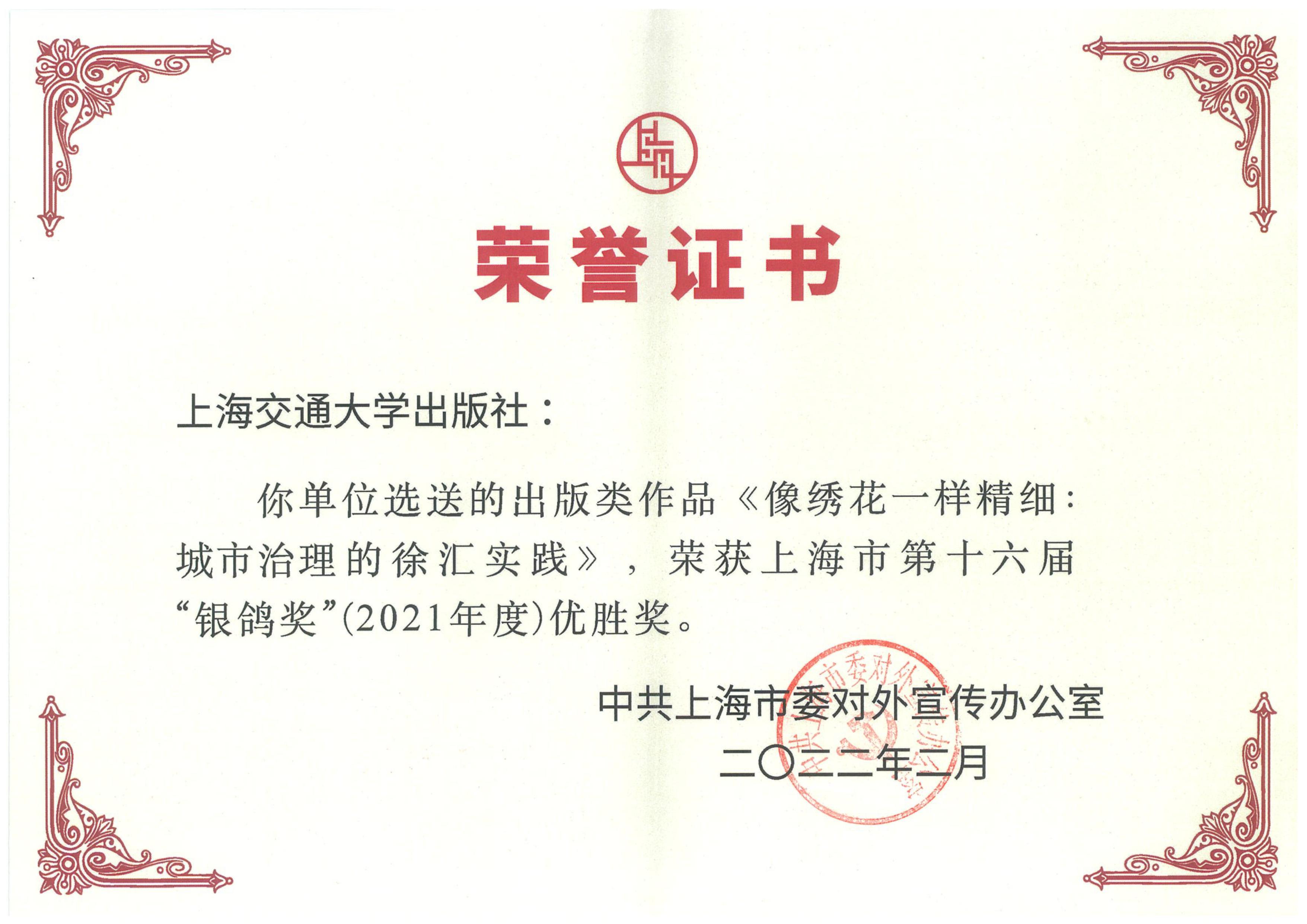 近日,由中共上海市委對外宣傳辦公室主辦的上海市第十六屆“銀鴿獎(jiǎng)”評選活動(dòng)結(jié)果揭曉。此次評選活動(dòng)共有214件作品入選本屆“銀鴿獎(jiǎng)”,其中出版類51件。我社《查醫(yī)生援鄂日記》榮獲第十六屆“銀鴿獎(jiǎng)”最佳出版獎(jiǎng)?!断窭C花一樣精細(xì):城市治理的徐匯實(shí)踐》榮獲第十六屆“銀鴿獎(jiǎng)”優(yōu)勝獎(jiǎng)。