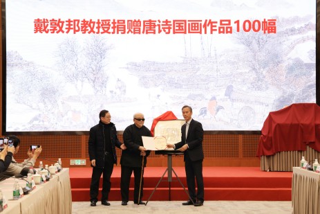 上海交通大學博物館執(zhí)行館長李仲謀代表學校接受了戴敦邦教授捐贈的唐詩國畫代表作品,并為戴敦邦教授頒發(fā)捐贈證書