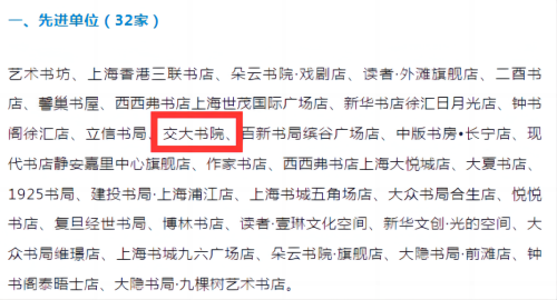 經(jīng)過上海市書刊發(fā)行行業(yè)協(xié)會的初評、總評,交大書院在80家品牌實體書店脫穎而出,成為了32家“先進單位”之一。