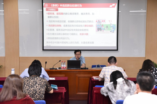 周洋對《條例》中違反群眾紀律的相關(guān)內(nèi)容進行解讀。他從遵守群眾紀律必要性、違反群眾紀律行為等方面進行詳細闡述,在講述六項禁止、懶政負面清單等內(nèi)容的過程中剖析真實案例,以案明紀。他指出,“江山就是人民,人民就是江山”,密切聯(lián)系群眾是我們黨的最大政治優(yōu)勢,脫離群眾是我們黨執(zhí)政后的最大危險。他還結(jié)合工作實際,向大家介紹如何運用“溝通三步法”有效規(guī)避工作中的矛盾,有效溝通從而提高工作效率,切實將黨紀學習教育成果運用到具體工作中。