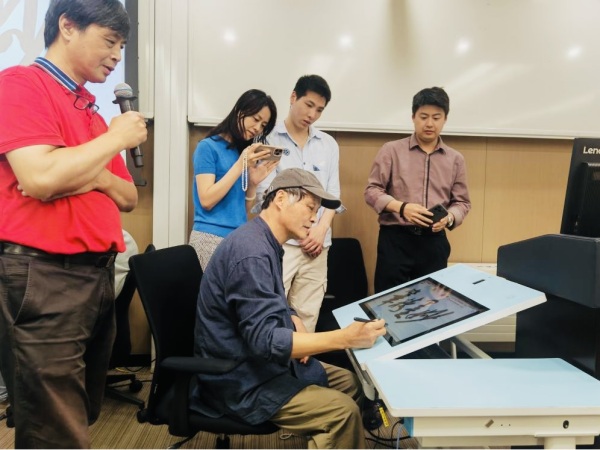 除了體驗“手工摹搨”外,活動還專門策劃了一項趣味環(huán)節(jié)——“數(shù)字摹搨”,由時空色彩(蘇州)信息科技股份有限公司提供技術(shù)支持。該公司自主研發(fā)的數(shù)字繪圖產(chǎn)品“馬良桌”在活動中大放異彩,許多老師在完成臨摹習(xí)作后紛紛來體驗這項“數(shù)字技藝”。通過配套的輸出設(shè)備,大家可以現(xiàn)場拿到一份自己創(chuàng)作的仿真書畫,藉此機會展現(xiàn)創(chuàng)作才華,在體驗過程中感受橫跨千年的技術(shù)對話。