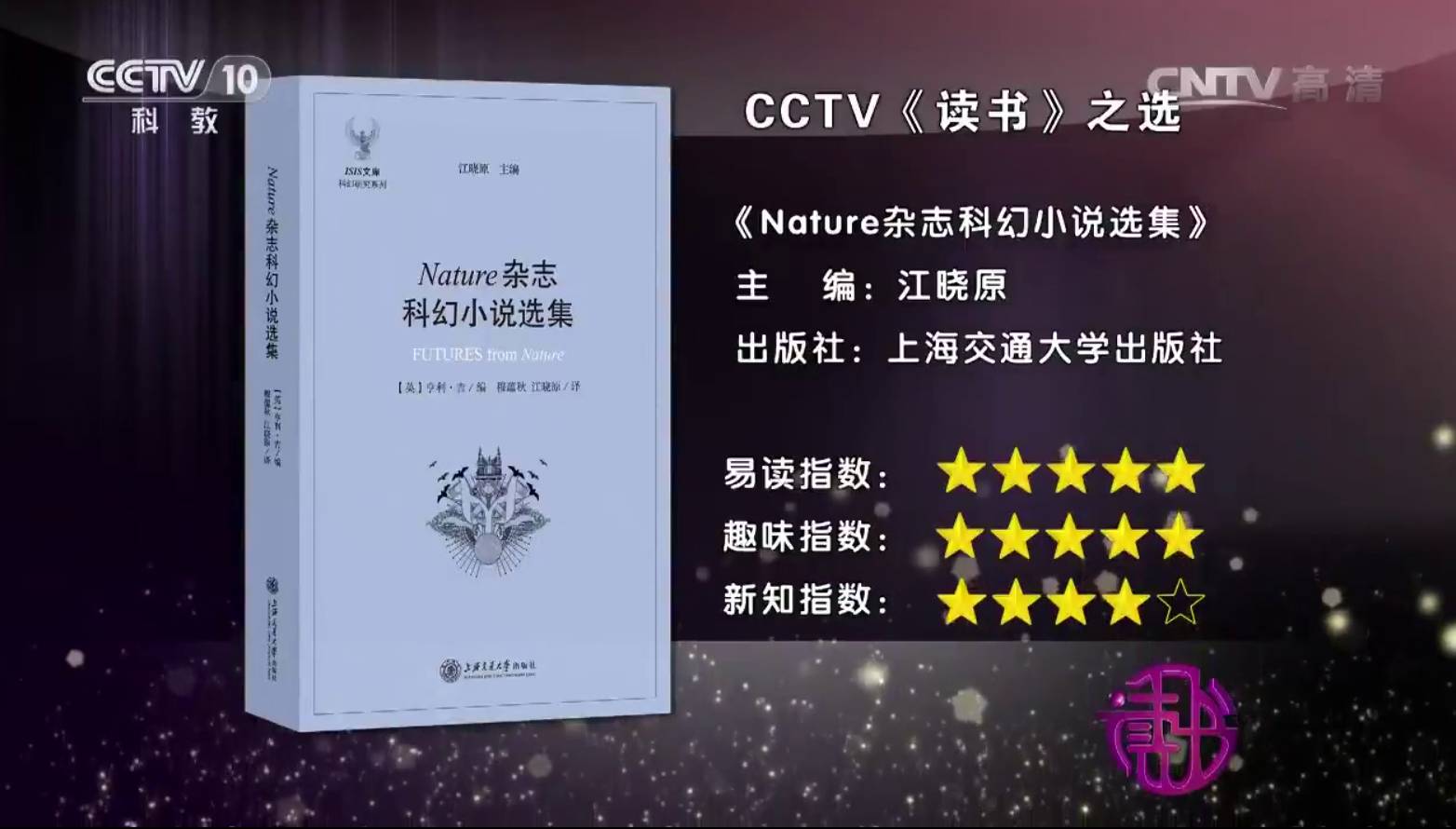 由上海交通大學(xué)出版社出版的《江曉原科幻電影指南》和《Nature雜志科幻小說選集》兩書于2016年10月10日登陸CCTV-10《讀書》節(jié)目。上海交通大學(xué)講席教授、ISIS文庫(kù)主編江曉原老師,科幻作家、《Nature雜志科幻小說選集2》譯者夏笳老師做客節(jié)目現(xiàn)場(chǎng),解讀科幻為人類未來世界帶來的無限思考。今天小薇送上節(jié)目視頻,點(diǎn)擊即可觀看哦~