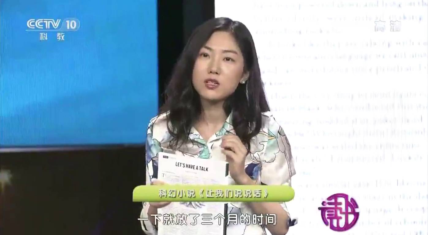 所以在這個(gè)故事的結(jié)尾,這個(gè)語言學(xué)家,他就成為了第一個(gè)去跟這些小海豹說話的人類。那在我的故事里,其實(shí)這個(gè)語言學(xué)家她是一個(gè)從中國(guó)來的一位女性的學(xué)者。所以她去跟這些海豹說話的時(shí)候,她第一句話,她打招呼用的是她的母語,是用中文說的。她說:“你好,讓我們說說話。”那么這些我當(dāng)時(shí)寫的時(shí)候,也是用中文來寫這兩個(gè)句子,而且“未來專欄”的編輯,他們也就把這個(gè)原版印在了上面。所以大家可以看到這個(gè)圖里邊它里面印了一行中文,就是“讓我們說說話”。所以這個(gè)小說發(fā)表之后,我的一個(gè)朋友就開玩笑說,這有可能是《Nature》歷史上第一次刊登出來中文。